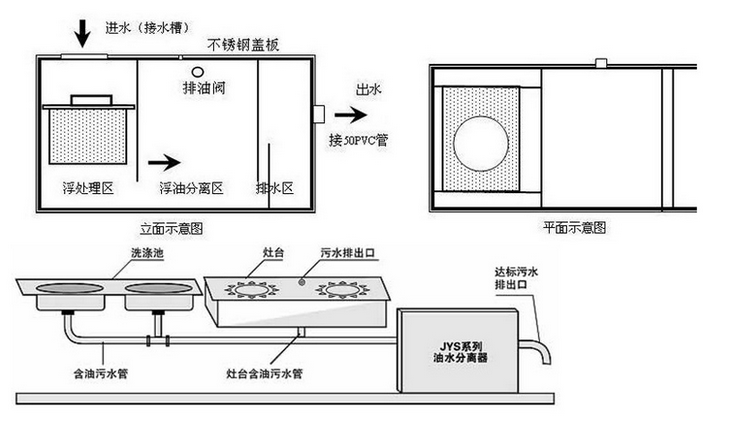 4.物理分选方法:油水分离器用于对含油废水进行油水分离,其工作原理是通过进水口进入,过滤后去除固体残留物,水中的油由下至上经破乳后油水分离,然后由底部出口排出。