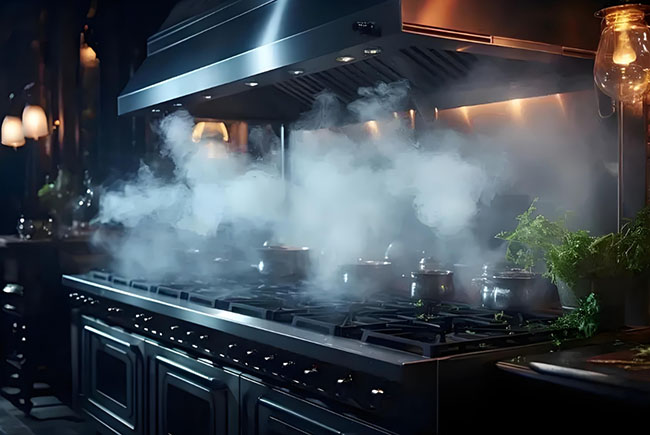 废气主要是油烟,蒸汽,热气,湿气,还有下水道散发的霉味,柴油散发的气味,渗漏的燃气等,主要通过排烟罩排到室外,没有排烟罩的工作间靠通风设备派出。例如,粗加工间,海鲜暂养间,杀鱼间湿气大,有腥味,不及时通风换气,过于潮湿就容易发生霉变,要及时清扫,及时通风,排除湿气。