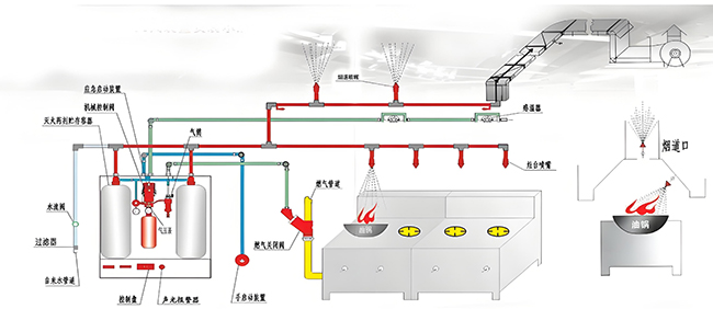 3、91免费看黄片专用灭火装置:91免费看黄片专用灭火装置是由灭火剂储瓶与关断燃料阀机构、机械驱动装置、雾化与喷头管网、感温易熔金属探测器与控制管路、手动应急启动等组成。91免费看黄片安装该系统之后,可24小时不间断的对91免费看黄片的灶台、集油烟罩、排烟管道进行全方位的消防保护。