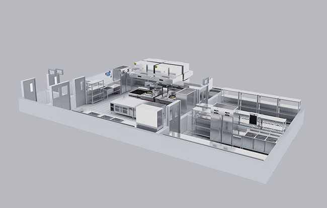 工艺需要专用设备,还需要满足功能需要的配套设备。在大多情况下,经营者只会提出所需要的主要设备,如炉具、蒸柜等。还有一些必需的通用设备不能一一列出来,如水池、冰柜、调料台、工作台等。这就需要设计人员结合实际情况,把需要的设备设计到位,并向经营者说明。在各功能区域内配齐设备,也就是完成加工工序所需要的冷冻、冷藏、洗、台案、车架、等多种设备。例如,所有加工工作离不开洗、刷、涮和案面上加工操作,台案、水池就是各工作间要素设备。工作间内要配齐设备,尽量不要跨工作间去完成加工工序。例如,主食加工间到副食加工间去淘米,煮面条,就跨越了工作间,为实际操作带来了不便。各种要素设备要尽量齐全,并且根据实际需要确定种类、型号、数量。